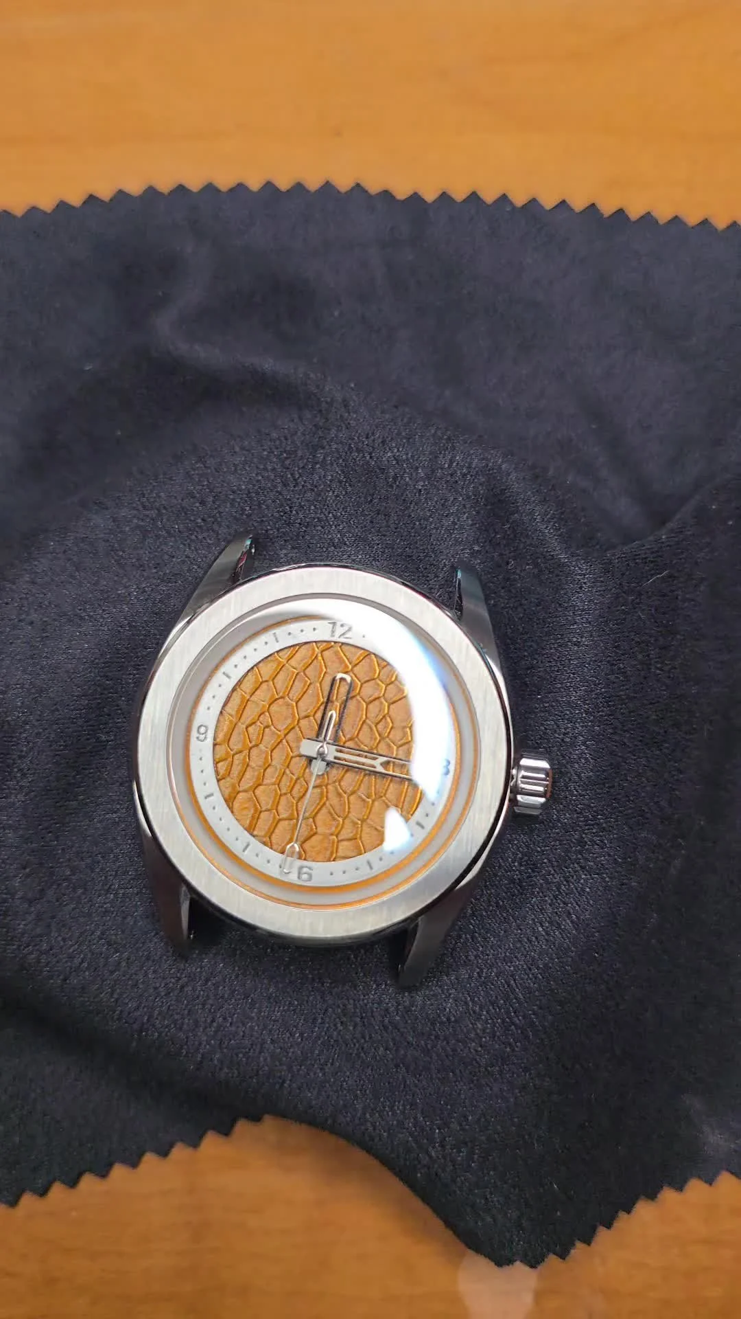 Brushed and polished stainless steel case with a vibrant orange sunburst dial, screw down crown, solid case back and high grip bezel. Silver hands match the silver indicies on the dial. Flat top double dome saphire crystal with a clear Anti-Reflective coating. Powered by a TMI NH35 automatic movement. Comes with a matching orange zippered case and two Zulu Diver bands. One orange rubber “N.D. Limits” with steel buckle and one black sailcloth with orange stitching.